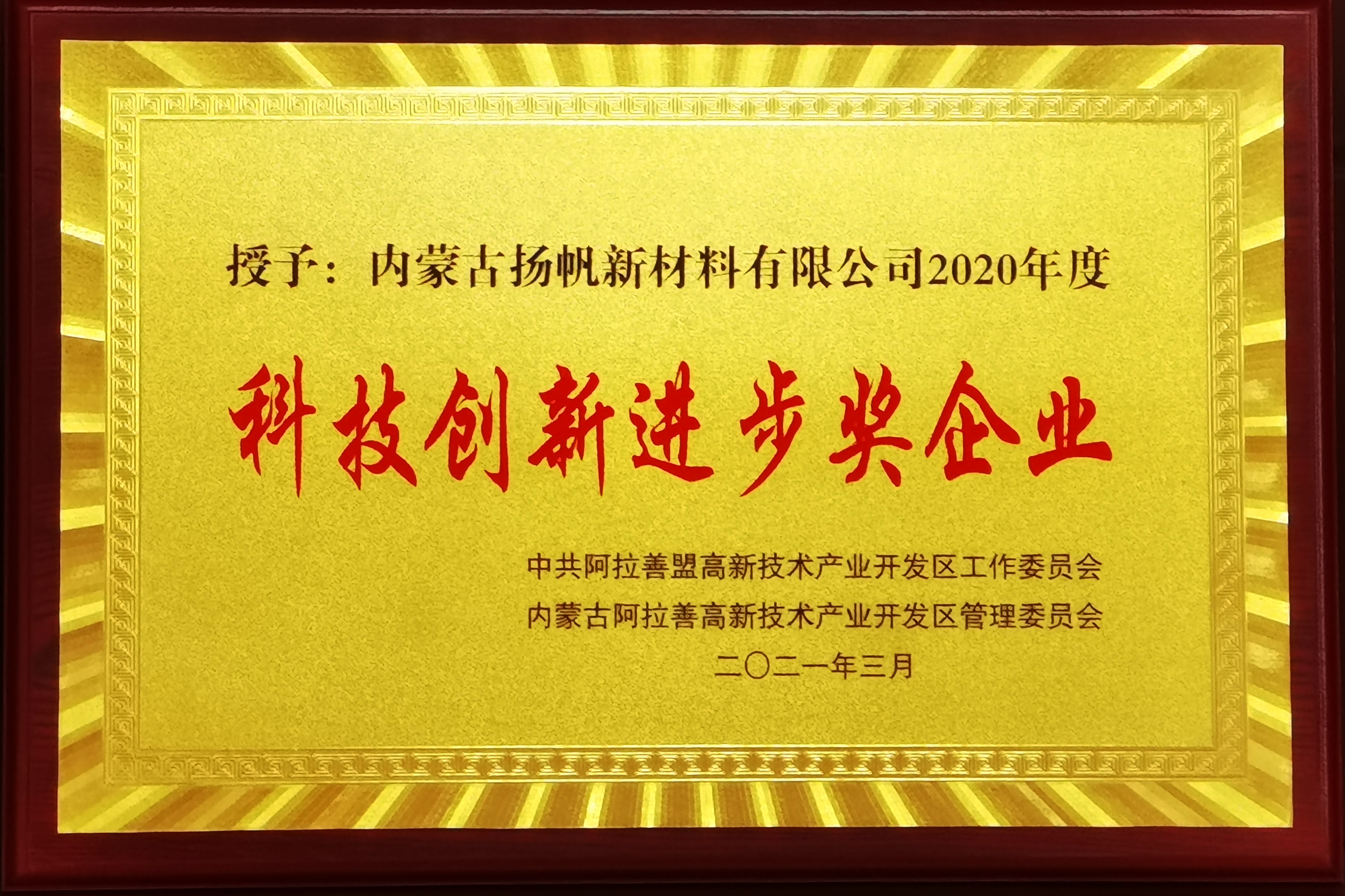 3月9日,阿拉善高新技術(shù)開(kāi)發(fā)區(qū)召開(kāi)“2021年度高新區(qū)、示范區(qū)黨的建設(shè)工作會(huì)議”,通報(bào)表彰了高新區(qū)、示范區(qū)在疫情防控和為地方經(jīng)濟(jì)社會(huì)發(fā)展做出貢獻(xiàn)的先進(jìn)集體和先進(jìn)個(gè)人。內(nèi)蒙古揚(yáng)帆新材料有限公司榮獲“2020年度科技創(chuàng)新進(jìn)步獎(jiǎng)企業(yè)”,公司總經(jīng)理劉輝獲“2020年度優(yōu)秀企業(yè)家”榮譽(yù)稱(chēng)號(hào)。