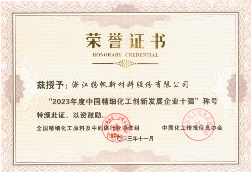 2023年度中國精細化工創(chuàng)新發(fā)展企業(yè)十強證書